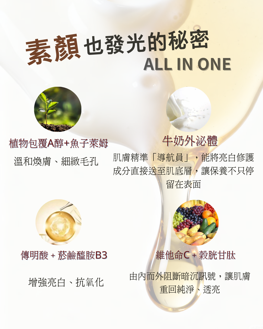 | 主要成分 | 牛奶外泌體、A醇、魚子萊姆、穀胱甘肽、傳明酸、維他命C、菸鹼醯胺 |