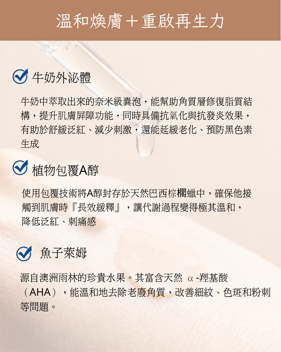 牛奶外泌體|牛奶中萃取出來的奈米級囊泡,能幫助角質層修復脂質結構,提升肌膚屏障功能,同時具備抗氧化與抗發炎效果,有助於舒緩泛紅、減少刺激,還能延緩老化、預防黑色素生成