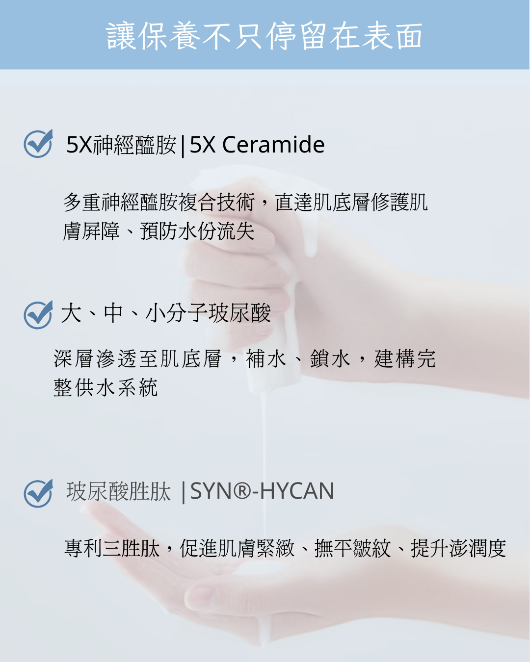 三重玻尿酸 |三分子玻尿酸作為深層滲透、補水、鎖水,建構完整供水系統