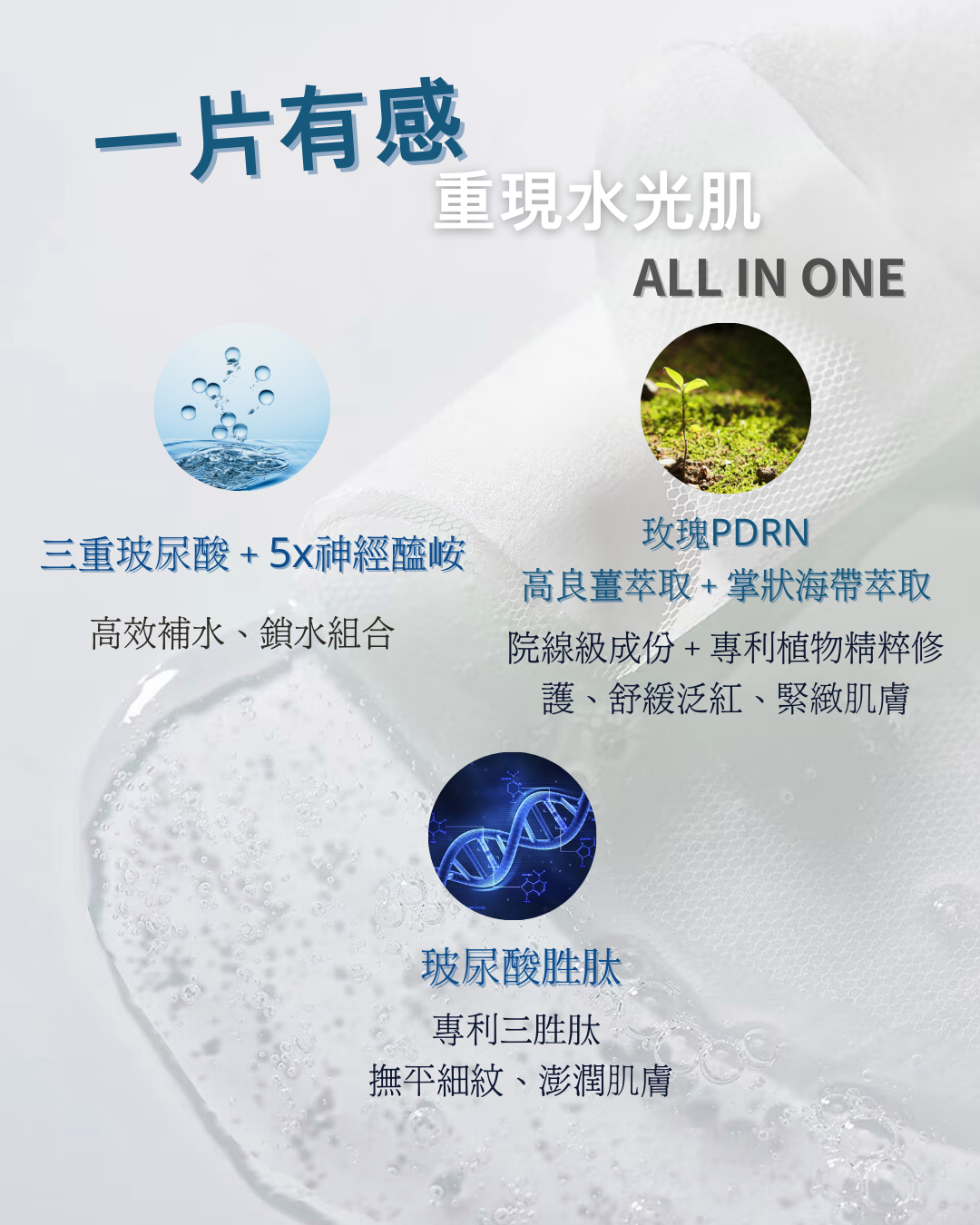 主要成分:玫瑰 PDRN、三重玻尿酸、5X神經醯胺、玻尿酸胜肽 、高良薑萃取、掌狀海帶萃取